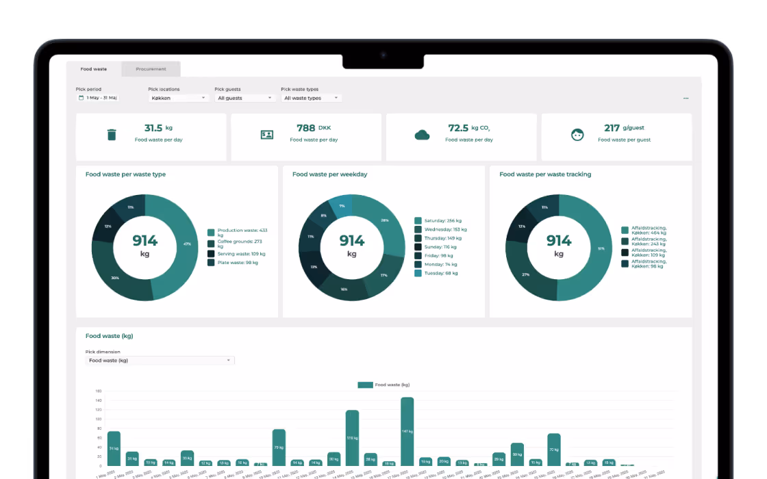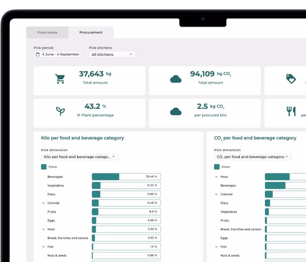 Report seamlessly on all sustainability metrics across your locations and make it available to your customers. Based on procurement data and our IoT food waste scales.